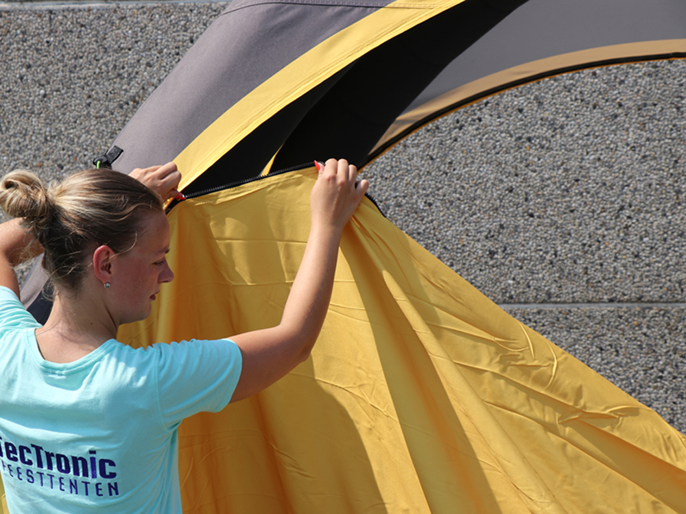 Het dakzeil is volledig los te ritsen van het frame. U verandert uw huisstijl, of kiest voor een andere sponsor? Geen probleem: u laat eenvoudigweg een wisselende reclame visual drukken.