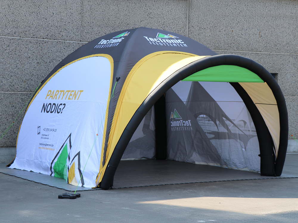 Uw opblaastent is perfect waterdicht, UV-bestendig en brandvertragend gemaakt. Ze is modulair uitbreidbaar: dit betekent dat u ze waterdicht kan koppelen met andere spidertenten (a.d.h.v. een personaliseerbaar verbindingsstuk).