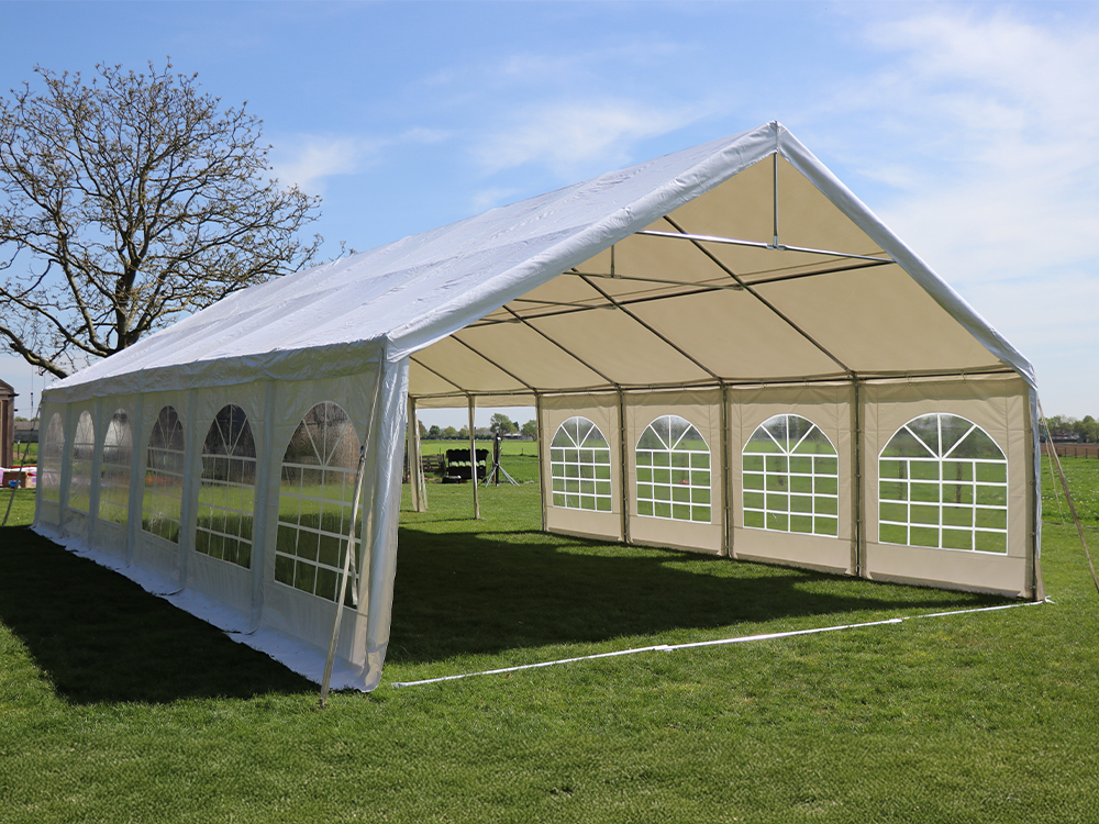 De constructie van gegalvaniseerd staal maakt deze feesttent uiterst stabiel, buizen van 38 mm en koppelstukken van 42 mm worden in elkaar gevezen. Uw frame is standaard uitgerust met extra nokversteviging. Wilt u nóg meer stevigheid kies dan voor het optionele grondframe dat u doorheen de zijwanden kunt schuiven.