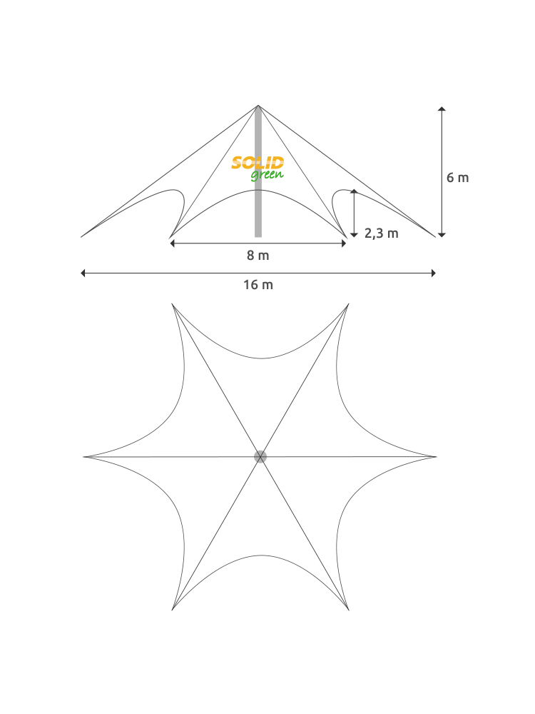 Professionele starshade met een diameter van 16 meter. Knappe, opvallende tent voor elk evenement. Het stervormige ontwerp trekt dadelijk de aandacht.