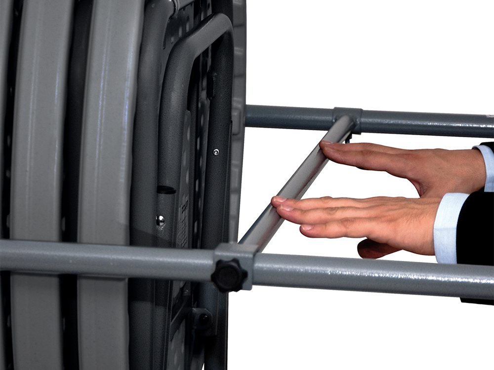 Deze transportkar biedt ruimte voor maximaal 20 statafels Plus. Het frame van gespoten staal is robuust en duurzaam, en de vergrendelingsstang zorgt ervoor dat de tafels stevig vastzitten, zelfs bij een halfbeladen kar. De kanteling van 4° houdt de tafels rechtop tijdens het laden, terwijl de gekartelde basis voorkomt dat tafels wegglijden.